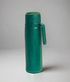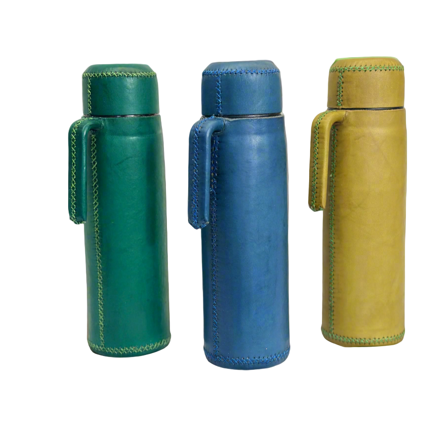 - Stainless steel thermos wrapped in leather and finished with a hand stitch