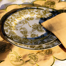 Part of our Shimla Social Collection, the Pembroke Safari Starter Plate captures the whimsy of a dense jungle, intricately painted in a safari green with branching tendrils, lush leaves, and vibrant blooms, evoking the rich tapestry of history and aesthetics from that era. If you look closely enough, you may even be able to spot a monkey hanging off a bough. Can be matched with Shimla Social coordinating pieces to create a complete place setting.