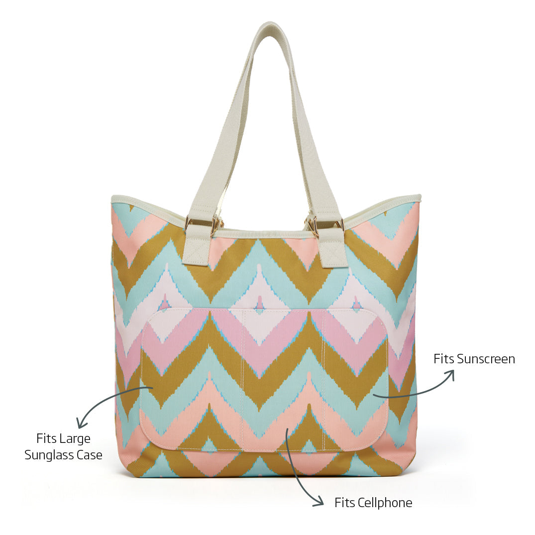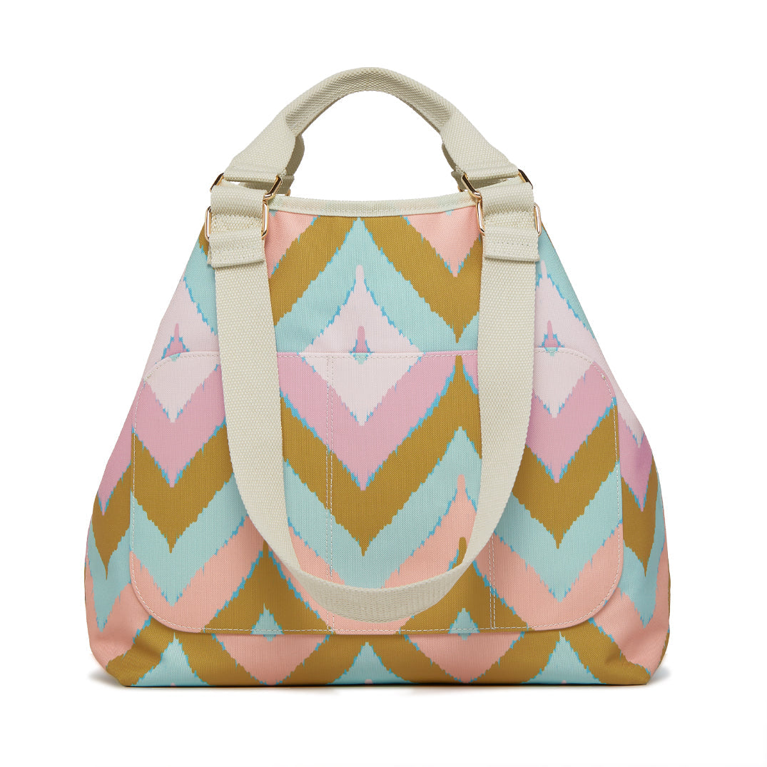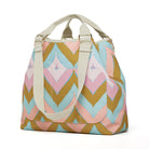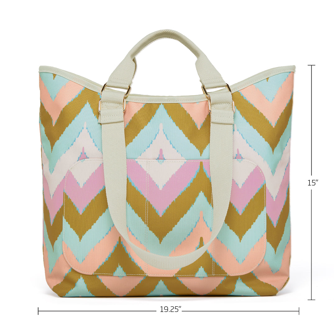 An oversized tote bag in a beautiful multi-color chevron pattern is a spacious and stylish accessory that combines functionality with a touch of cool. The modern shades and vibrant hues of the pattern create this captivating zigzag design.