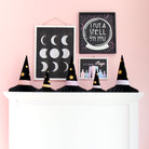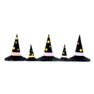 Set of 5 large honeycomb witch hats with colorful bands and gold glitter stars. Measure appx. 12" and 18" tall. Perfect for hanging from your ceiling or placing on a tabletop or mantel. Or you can open them halfway and attach to the wall.