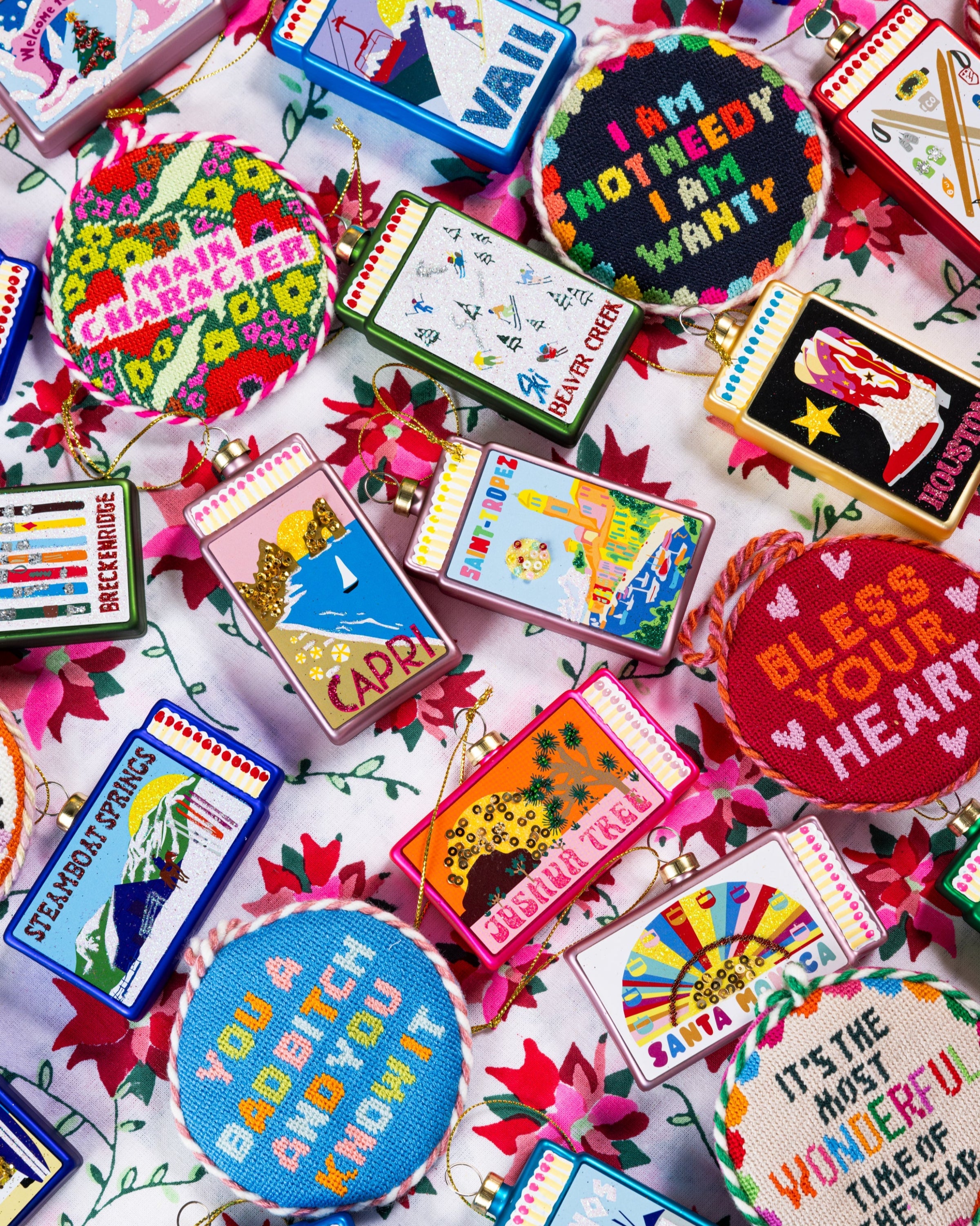 Take your holiday decor from trad to rad with Furbish's curated assortment of festive needlepoint pillows, ornaments, tree toppers, stockings, and tree skirts.