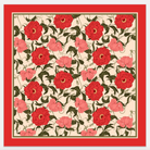 Scarlet petals and olive leaves envelope the scarf in a vibrant garden. Enjoy our hand-rolled silk scarf as a head covering, neck accent, or as an airy top.