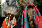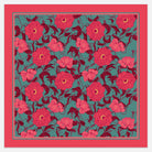 Ruby pink flowers entangled in a teal sky suspend the scarf in a whimsical trance. Enjoy our luxurious silk scarf as a head covering, neck accent, or as an airy top.