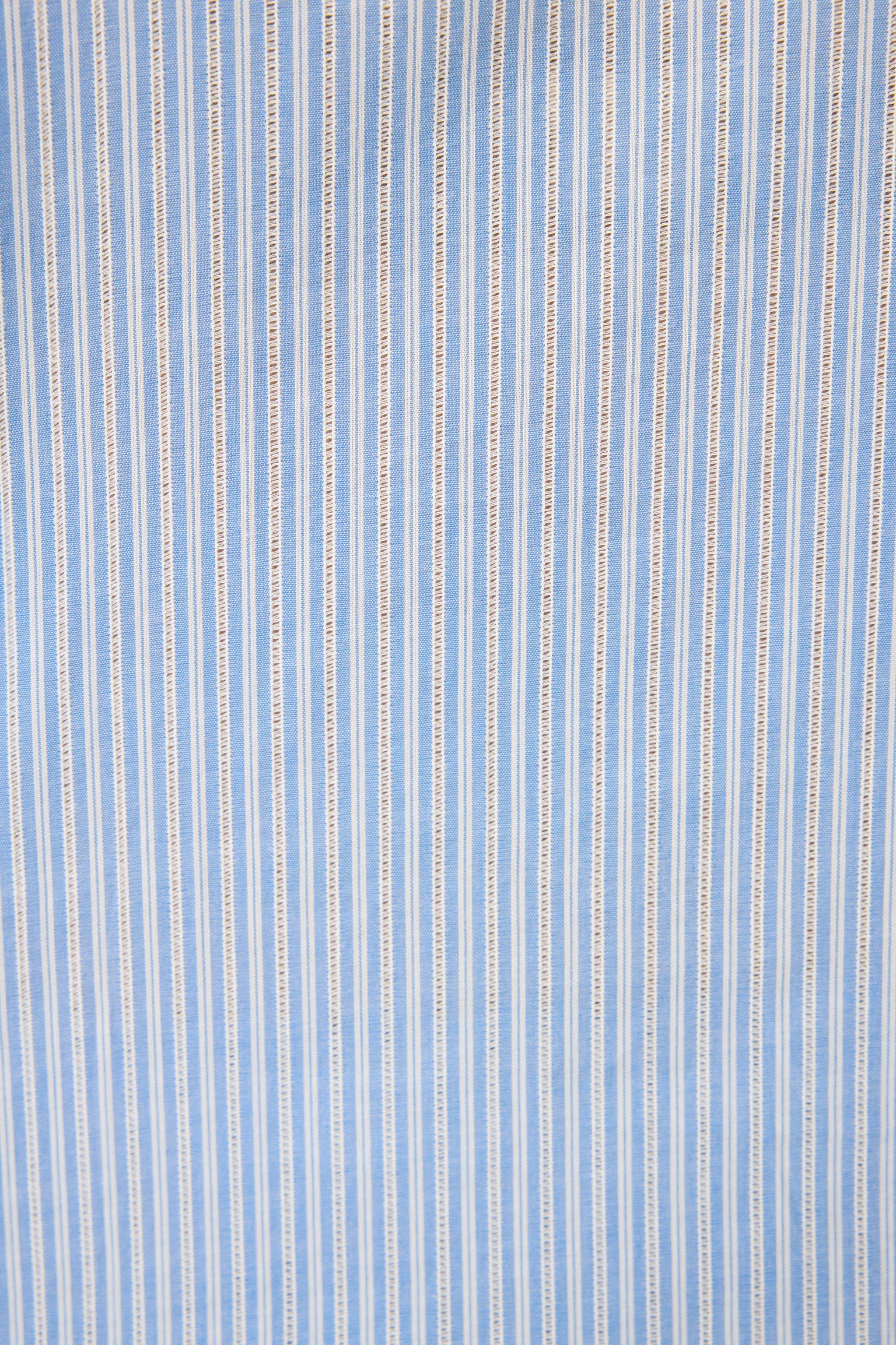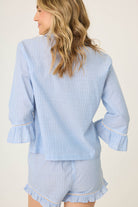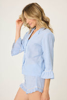 A classic button-up with a breezy, romantic spin. Crafted from airy striped cotton, this lightweight shirt combines crisp structure with fluttery ruffled sleeves and delicate ladder stitching. Polished yet playful, it’s the perfect mix of put-together and carefree. Pair it with the matching striped shorts for a set that feels like a spring daydream.