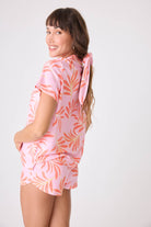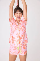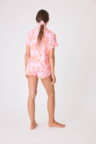 Your go-to for warm nights and sunny mornings. This tropical print pajama set, with its soft pink hue and neon green piping, is crafted from ultra-soft butter jersey for the ultimate in comfort. The short-sleeve button-front top pairs perfectly with the shorts that feature a tie waist for an easy fit. The set also includes a matching scrunchie for the perfect finish. Whether you’re lounging in bed or sipping your morning coffee, this set brings tropical charm to your downtime.