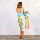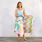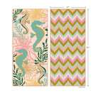 A modern interpretation of an underwater fantasy, this reversible microfiber Go Big Towel depicts vibrant seahorses in their natural habitat on one side, and an updated artistically inspired colorful chevron on the other.