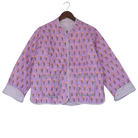Meet The Charlotte — the spirited sister to our signature quilted jacket. This jacket lavender with pink and blue floral accents.