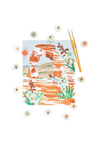 Arches National Park paint-by-number kit depicts Delicate Arch—the most noteworthy freestanding natural arch in the park. Surrounding this rock formation, you’ll paint the stunning narrow narrow-leaved yucca plants in bloom—one of which hides a tiny plateau fence lizard nestled at its base.