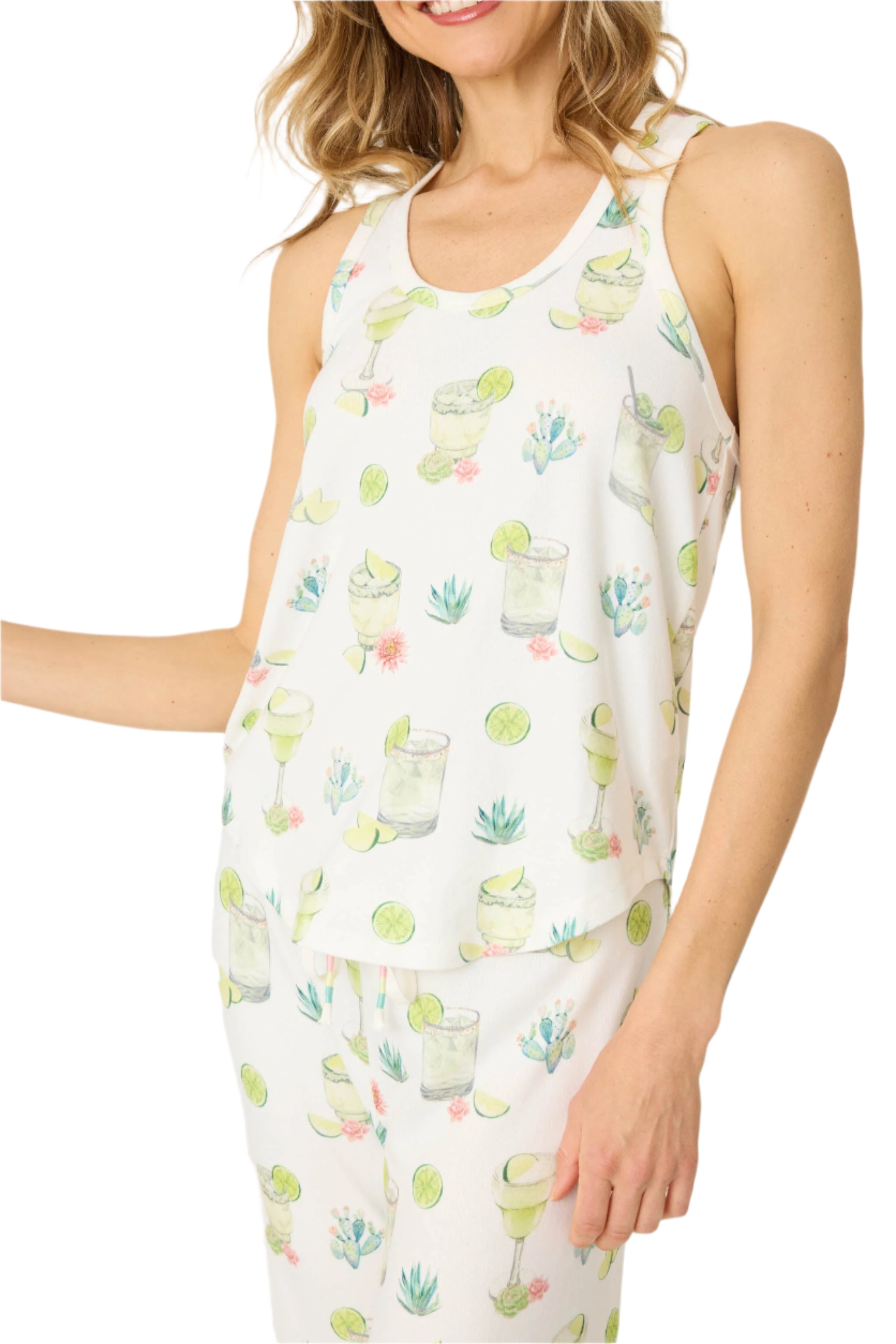 Shaken, stirred, or straight-up cozy. This margarita-printed racerback tank is a toast to laid-back lounging, crafted from the softest butter jersey. A breezy fit and curved hem keep things easy, whether you're sipping something citrusy or settling in for the night. Pair it with the matching shorts or lounge pants for the full happy-hour-at-home vibe.