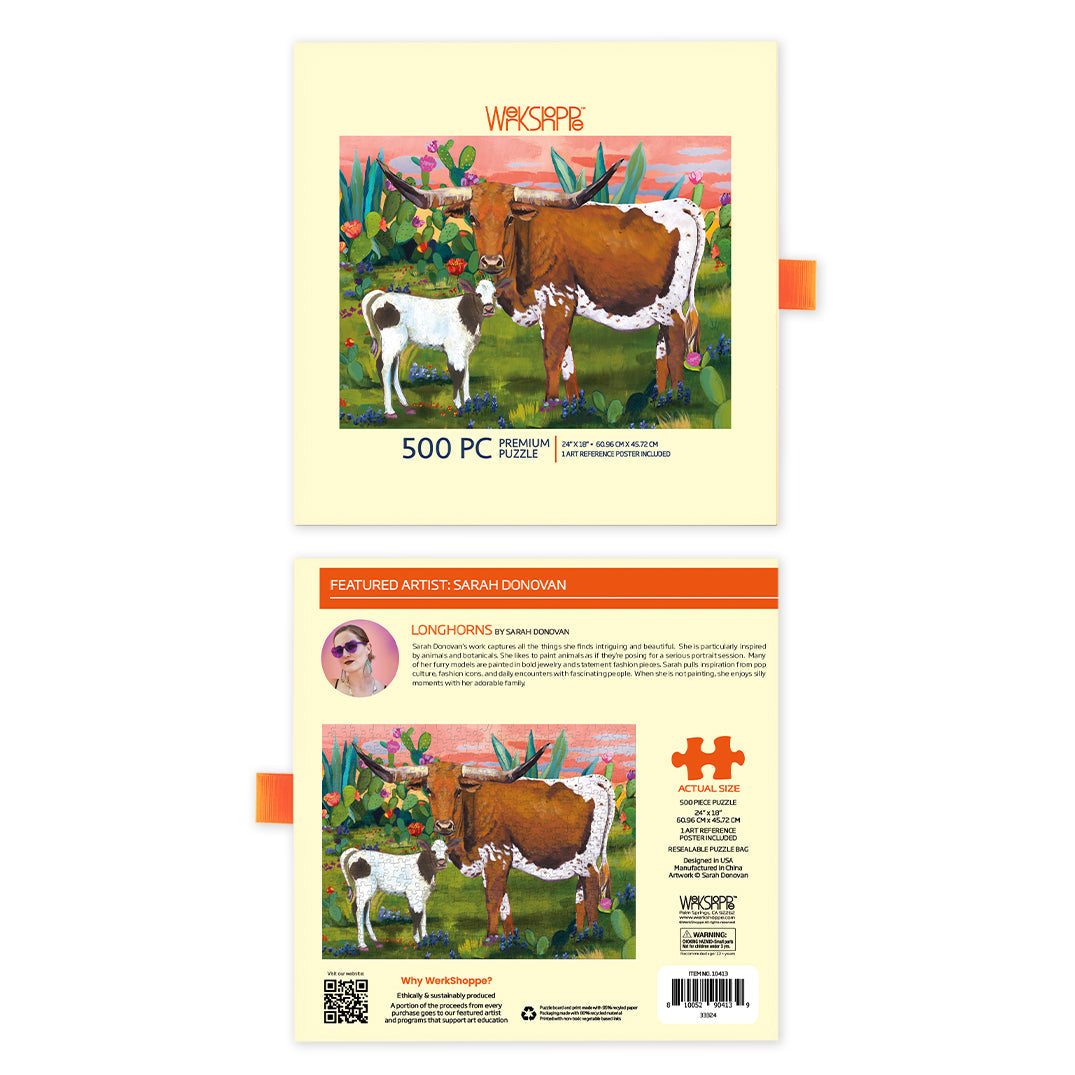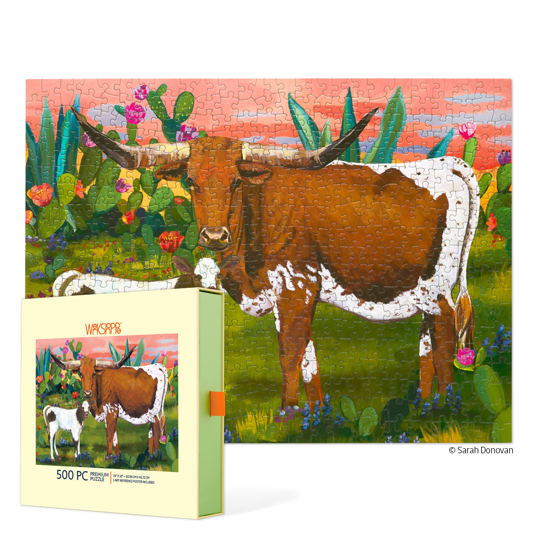Experience the American longhorn in a natural prairie setting with this stunning 500-piece jigsaw puzzle. The silhouette of a longhorn cow and her tender calf is captured in colorful detail from the animals' calm gazes to the hazy layers of the rugged landscape.